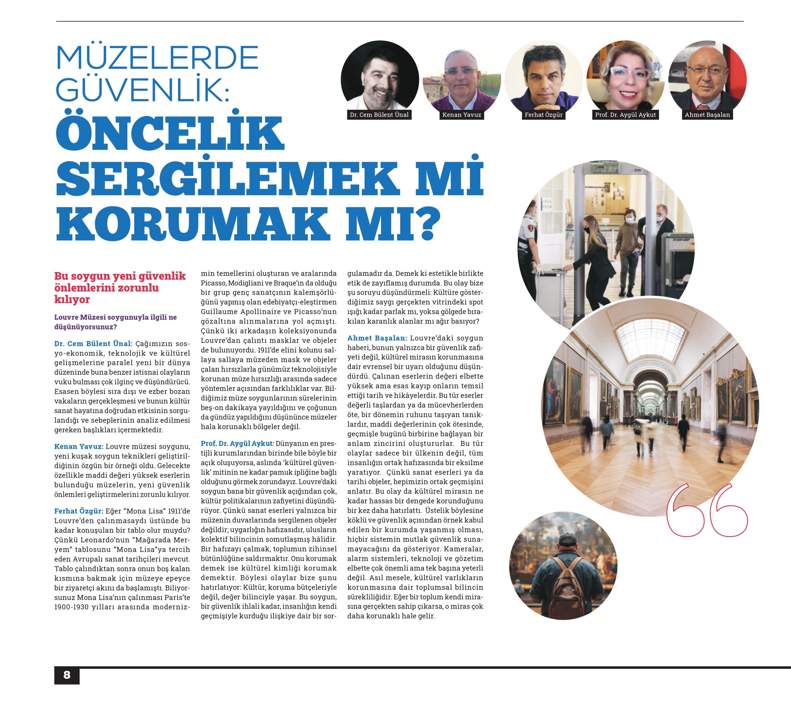 Ahmet Başalan: Ülkemizde müze güvenliği konusunda son yıllarda belirli bir farkındalık ve iyileşme gözlemliyoruz. Özellikle yeni kurulan ya da yenilenen müzelerde teknolojik güvenlik sistemlerine daha fazla yatırım yapılıyor. Ancak yine de bu alanda asıl gelişimin yalnızca teknik ekipmanla değil, sürdürülebilir bir bilinçle mümkün olabileceğini önemi sebebiyle tekrar belirtmek istiyorum. Türkiye, çok katmanlı bir tarih ve kültürel miras barındırıyor. Bu kadar zengin bir geçmişe sahip bir coğrafyada, müzelerin güvenliği yalnızca fiziksel koruma değil, aynı zamanda kimliğimizi ve belleğimizi koruma meselesidir. Bu yüzden güvenlik politikalarının sadece ‘önlem almak’ değil, ‘değer bilincini güçlendirmek’ yönünde evrilmesi önemli. Kısacası, ülkemizdeki müze güvenliği teknik açıdan gelişme gösteriyor olsa da, bu sürecin kalıcı hale gelmesi için kültürel mirasın toplum genelinde sahiplenilmesi gerekiyor.